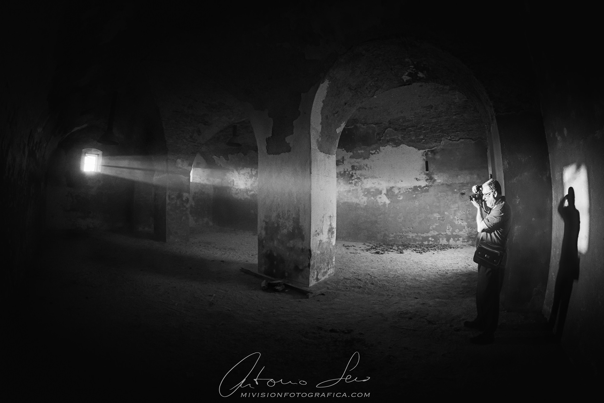 En los polvorines de al lado de Bahía Sur podemos encontrar unos del siglo XVIII que se encuentra en pie aun aunque le han robado partes de las ventanas, tenían metal y por venderlo y sacar dinero los han destrozado, un día de una salida de la AAF-Cádiz fuimos a visitarlos y todos hacían la foto a contra luz buscando el haz, así que decidí pedirle el ojo de pez a mi compadre Roberto e incluir en el encuadre a un fotógrafo, así me llevaría una foto distinta a la de todo el mundo.